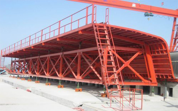橋梁模板制作由底模、外模、內(nèi)模三部分組成:首先是底模。箱梁一次灌注混凝土重量達(dá)530多噸,加上梁體橋梁模板重達(dá)90多噸和每平方米1.5KN的施工荷載,底模每延米荷載達(dá)27噸以上。為使底橋梁模板制作的剛度大且滿足受力均勻的要求,底模面板采用12mm厚的鋼板與槽鋼組成井字型整體焊接結(jié)構(gòu),利用鋼結(jié)構(gòu)底橫梁將底模受力傳遞到臺座基礎(chǔ)。井字型結(jié)構(gòu)分段制作,便于調(diào)整其平整度和底模的反拱度。